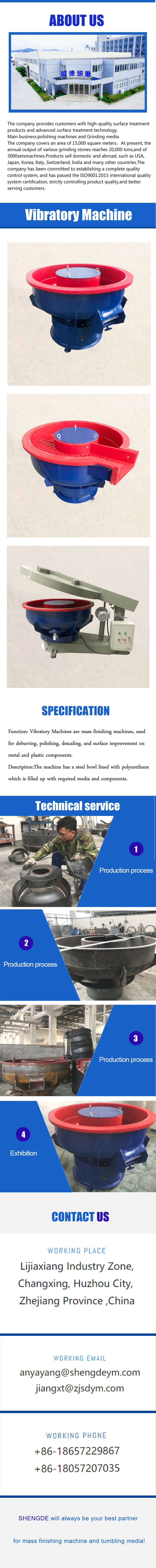 The machine has a steel bowl lined with polyurethane which is filled up with required media (either ceramic, plastic, maize etc. depending upon the finish required) and components. Eccentric weights are mounted on an extended shaft attached to a heavy duty motor to cause vibrations and create a spiral of the media and the components. Variations in vibration, achieved by varying weights and angles, and suitable combination of media enable machine to be used for different components.